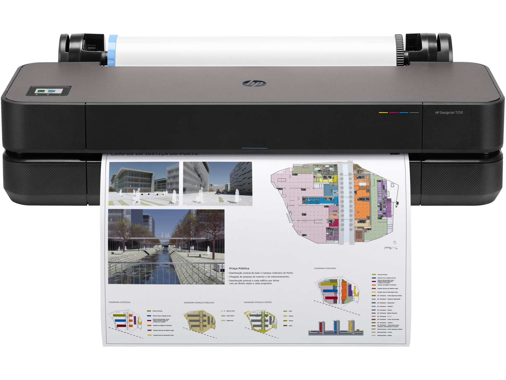 Conteúdo da caixa: Impressora HP DesignJet T250 24 polegadas, cabeça de impressão, cartuchos de tinta introdutórios, eixo, guia de referência rápida, pôster de configuração, cabo de alimentação.